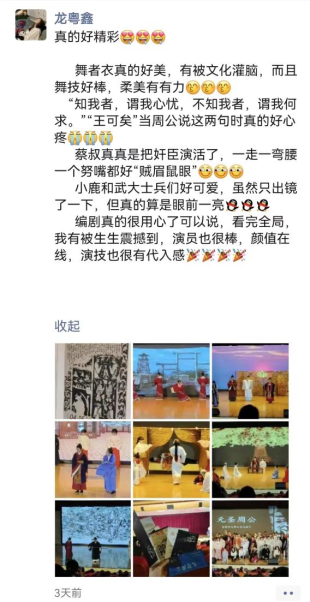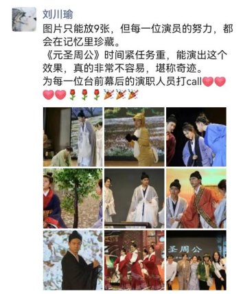 自《元圣周公》筹备以来,困难重重,本该在去年上演的戏剧受到各种因素的影响不断推迟,全体演职人员的共同努力下,一年来的辛勤汗水,终于在这一刻浇灌出成功之花,为师生们呈现出一场精彩的戏剧表演