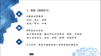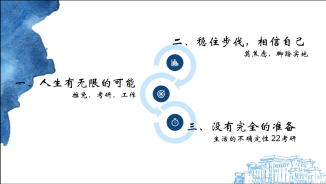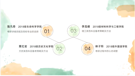 “一个领域就是life is journey,就是把人生当作一条旅途,那么考研也是我们漫漫人生路的小小一段一段路,它也会有起点、过程、终点。来自外国语学院2018级英语(创新实验班)专业本科生林子羚如是说。在2022年研究生考试中,她被录取至中国科学院大学外国语言学及应用语言学专业。林子羚同学主要分享了考研过程中的一些应试技巧与心态调整的问题。首先,她认为我们应该先根据自己的实际情况定好目标院校及专业,随后收集信息的过程中尽可能找到目标院校有经验的学长学姐探讨,同时,还应关注当地院校的一些优惠政策,充分结合自己的专业,努力做到最优规划。其次,林子羚建议:在备考的过程中,应该树立自信心,减少精神内耗,努力接纳自己的情绪及状态,尽量保持积极乐观的心态。认为每个人都是独一无二的,我们遇到的每一次困难与挫折,都是通向成功最好的安排。