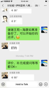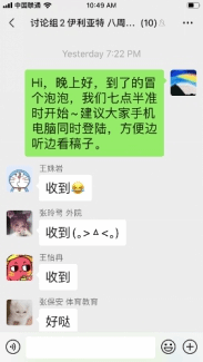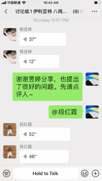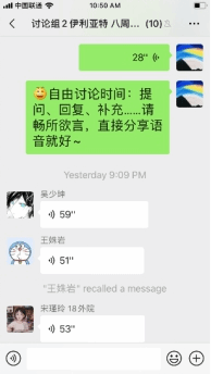 作为本学期的第一次讨论课,为了让同学们更加从容地在线分享及问题回顾,采用微信群逐条语音形式进行。讨论课共分三个环节,从个人汇报、自由讨论到一句话小结,同学们准时上线,积极参与,热闹有序。