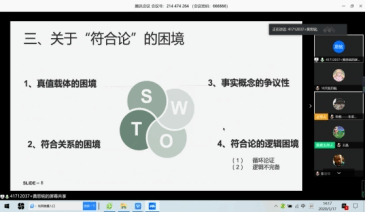 在教师点评答疑环节,王晶老师分享了自己的观读体会,对同学们的讨论结果予以中肯的评价,并针对其中由代表性的讨论观点进行了总结。并且,就大家有待深化、存在误区的领域进行了细致的讲解与纠正。如关于语义真理论中的“开语句”与“闭语句”问题。