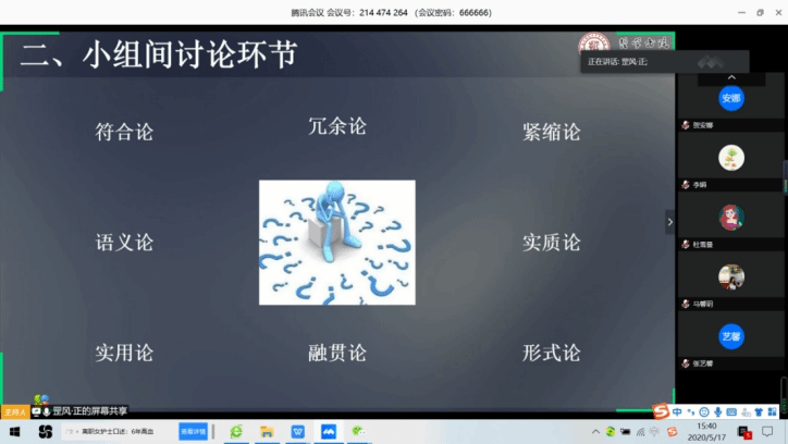 经过精心筹备,第二次讨论课于5月17日在腾讯会议上顺利进行。本次讨论按照计划分为两个部分,首先是各小组派代表轮流对数周以来阅读、总结、讨论的成果进行展示。各小组都对各自所持或所感兴趣的“真”与真理论的立场进行了精彩的展示与解读。
