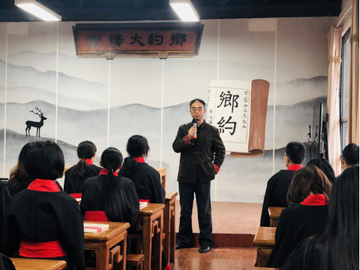 上午10时左右,牛兆濂先生之曾孙牛锐老师为同学们做了一场以“书院学习模式”为主题的讲座,牛老师分享了牛兆濂先生的生平故事与传奇经历,并结合自己学习《论语》《易经》等儒家经典的体会与思考,与同学们就儒家文化的传承、书院教育模式的开展、乡约的当代意义等问题展开探讨。