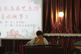 首先,在暖场节目中,来自历史与文化学院的王一帆同学和文学院的李文同学,身着典雅汉服,一人奏响悠悠古琴,一人手捧淡淡香茗,给大家带来一场名为《易水慨古》的古琴与茶艺表演,是一场极具中国特色的视觉盛宴;文学院的李悦同学演唱了一首自己的原创歌曲《当你出现》,羞涩中难掩瞩目才情;哲学与政府管理学院的黄阔和郑乙淇同学带来悦耳动听的吉他弹唱《那些花儿》;最后哲学与政府管理学院的彭方中、范思韵同学,文学院的何蔼晴、林嘉慧、韦艳丽同学以及化学化工学院的薛洁莹同学为大家带来了一场别致风趣的粤语朗诵《诗经·小雅·斯干》和《少年中国说》,以多姿多彩的方式淋漓尽致地呈现了书院浓郁的人文气息。