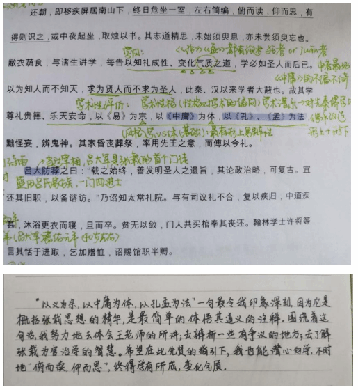 在教师精讲结束后,同学们就自己的思考与疑惑再次发起讨论,指导老师则做出了进一步的解释和启发。同学们的积极参与,所思所得不但体现在课上的解读和发言环节,也体现在课后的整理与感悟中。