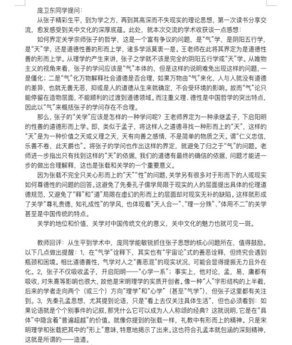 在教师讲解的第二阶段:王老师针对同学们的发言和文本内容进行了学理的补充,并随后对张载从“生平到学术”的发生过程做了多角度的说明。他将前沿学术界可能有争论的问题向同学展示和解说,引导同学做出自己的评判,鼓励同学们对学术问题有自己的思考,启发同学们思考,激发了同学们的探索兴趣。