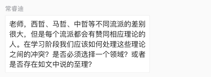 江老师还进一步对《正蒙序》对佛、道批判所体现出来的方法论意义进行了阐发。他指出,对于张载来说,对佛、道的批判并不仅仅是儒学与佛、道的价值之争、立场之争,因此并不能将张载的立场看作是狭隘的文化本位主义、文化民族主义。张载实际上是站在真理的立场上与佛道“校是非”,他真正关怀的是“至道之要、不二之理”。江老师也借此鼓励同学们勇于追求真理