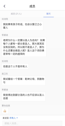 随后是互动问答环节,李老师鼓励同学们可不囿于今日所讲,进行自由提问。大家就张载的民胞物与、圣人观、心性论、政治理想等思想进行了提问和热烈的讨论。