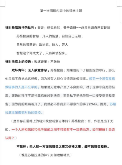 第一次读书心得,大家目前做到的程度,还是超出了我的预想。大家对有限文本的解读,抓住了苏格拉底所要呈现的几个非常重要的主题。对这些主题也进行了必要的知识梳理和观点呈现。不过,也对大家提出以下几个方面的建议: