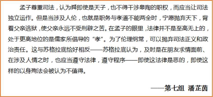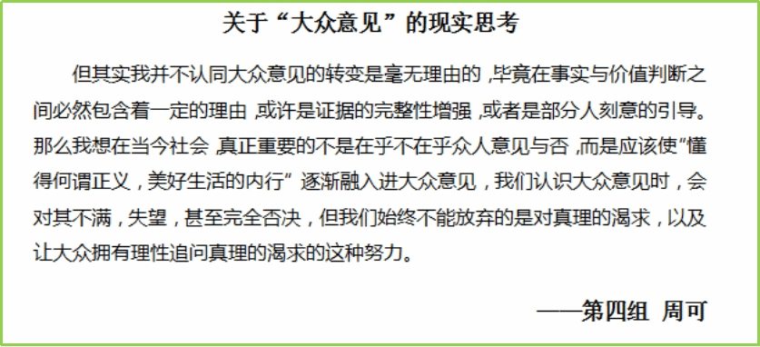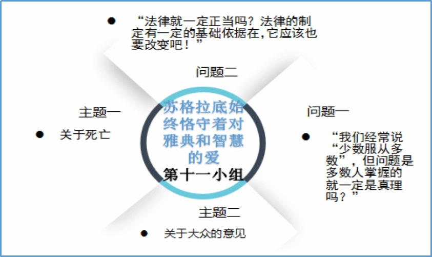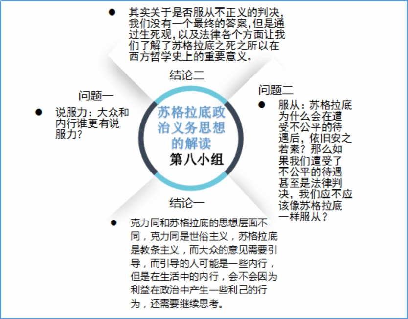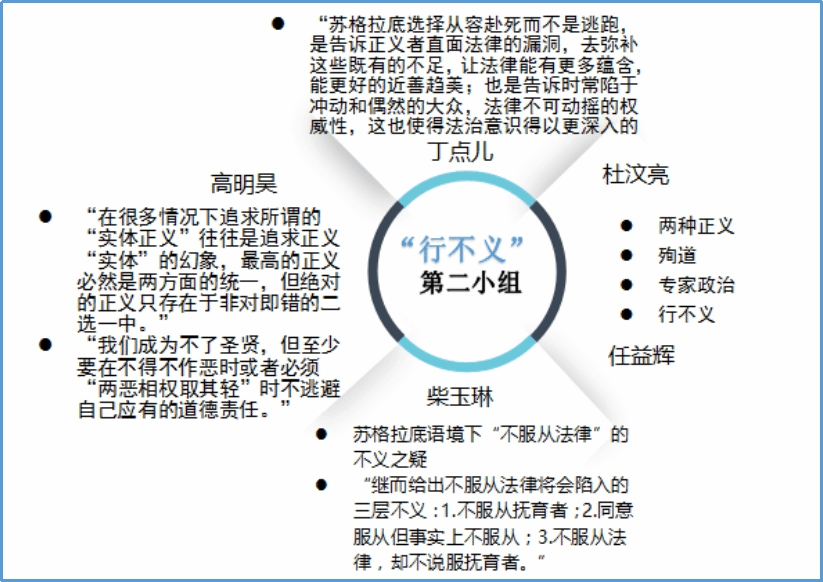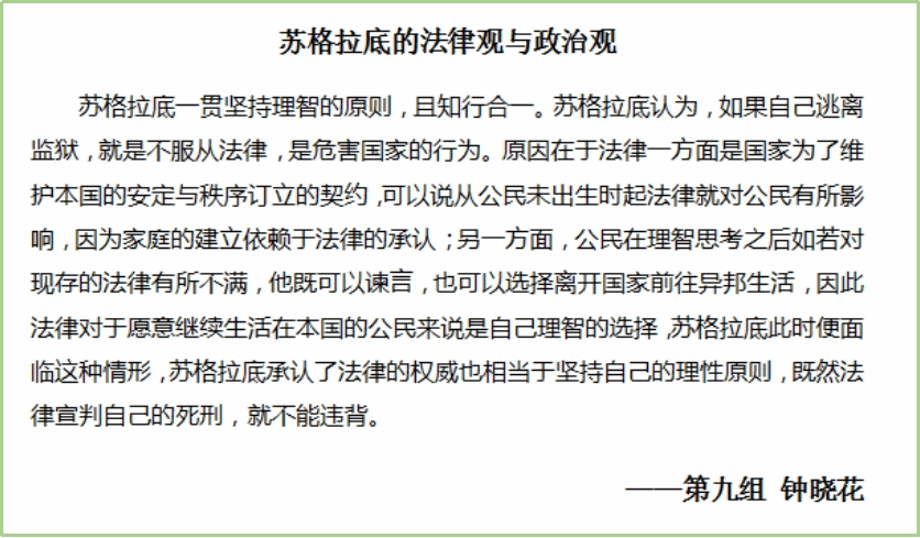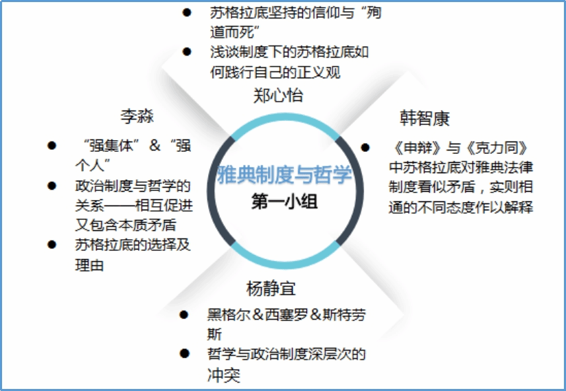 本周是读书会的最后一周。经过前两周对《苏格拉底的申辩》的细致阅读和审慎思考,同学们都对苏格拉底之死引发的一系列问题作出了自己的回答。本周进入《克力同章句》的阅读,同学们从更多的角度出发,探讨苏格拉底的哲学思想与形象。在每日轮值小组的带领和引导下,大家围绕《克力同章句》提出诸多问题,展开有序的讨论,互相分享延伸阅读的材料。基于理性的思考和包容的态度,来自不同专业的同学得以对自己的观点进行阐发和辩护,思想碰撞的火花也得以闪烁其光。