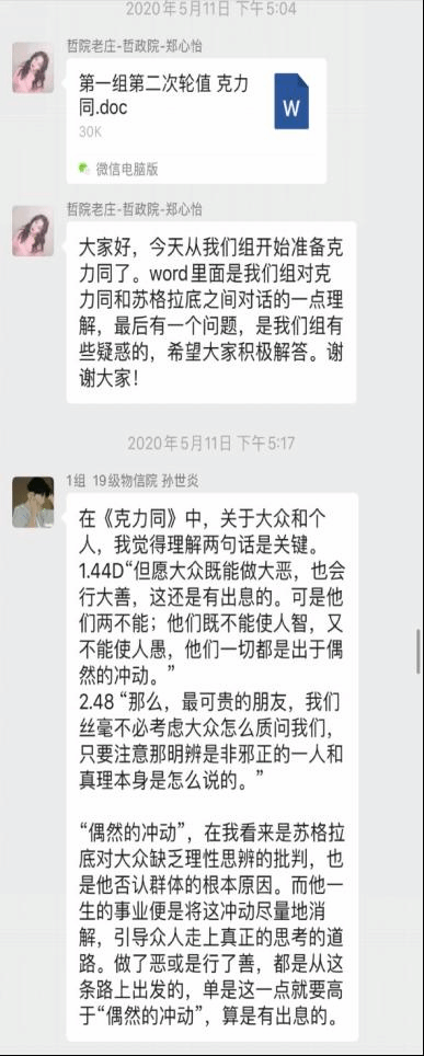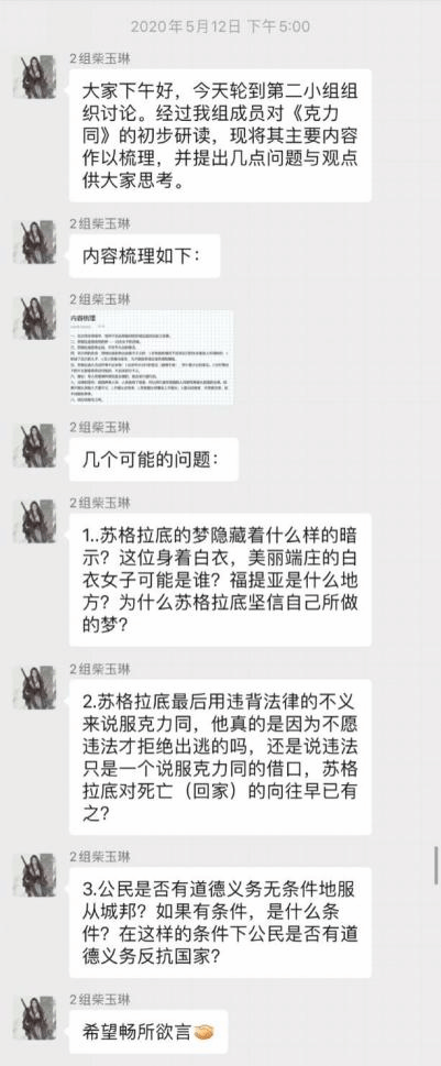 专业导师石碧球老师带读。本次读书会采用了老师导读,小组讨论,成员撰写阅读心得,集中讨论,最后小组互评和老师点评的形式,同学们积极参与,讨论热烈,收获良多。在逐步深入的交流中,师生共同走近苏格拉底,领略了苏格拉底的智慧,走近那个伟大的时代,探讨了古希腊雅典时期的时代特征。每个小组成员都受益颇多,不仅学习到了深厚的经典知识,而且在和小组成员的交流讨论中碰撞出了思想的火花,并且穿梭时空和苏格拉底进行了充满智慧的对话,可谓一举多得。到此,西方哲学经典“云”读书会圆满结束,虽然读书会已经结束,但其带给我们的启发却令人回味无穷,相信同学们也在这过程当中进一步了解了古希腊雅典文化,也更加激发了同学们对其的兴趣。生命不息,阅读不止!望同学们继续在学海中探寻自己的智慧!继续充实自己!