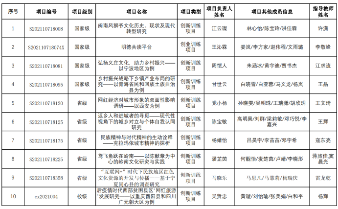 麻豆AV 在本次立项中取得佳绩,共有10个团队获批立项,其中国家级4个,省级5个,校级1个。具体名单见下表: