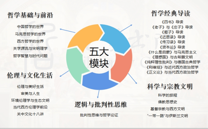 建设了“哲学基础与前沿、哲学经典导读、伦理与文化生活、逻辑与批判性思维、科学与宗教世界”五大模块共27门通识核心课程,每学期开设12-14门课程供学生修读。更多的课程正在建设中。具体课程信息如下: