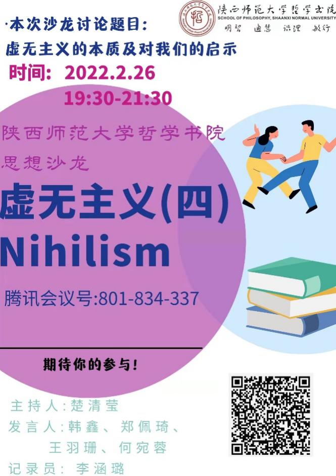 上一次,我们重点讨论了虚无主义的本质,同学们各抒己见,从不同层面为我们展现了有关虚无主义本质的探索。我们深知诸如“本质”“实质”远远不能简简单单地就得出所谓“正确结论”,但我们会不断朝着这个目标前进。本次沙龙将重点讨论虚无主义对我们的启示,会有四位同学与我们分享关于虚无主义带给我们的启示。我们能从虚无主义浪潮中领会到什么呢?敬请期待!其他的同学也会在四位同学发言完后参与分享交流环节,分享自己的观点和看法。欢迎老师同学们前来与我们一起探索!同时,这也是虚无主义沙龙的最后一次线上相聚了,感谢大家一直以来的关注与陪伴!最后,希望大家可以天天开心!Don’t just exist, live.