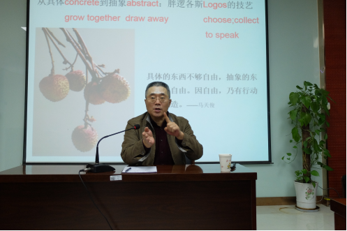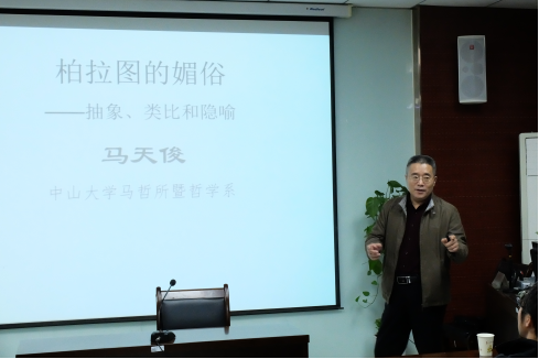 “思想星空大讲堂”第四讲在哲学与政府管理学院二层报告厅准时开讲。本次讲座有幸请到中山大学哲学系的马天俊教授,所讲题目为《柏拉图的“媚俗”——抽象、类比和隐喻》,讲座由哲学系宋宽锋教授主持。石碧球副教授、王荔副教授与会。