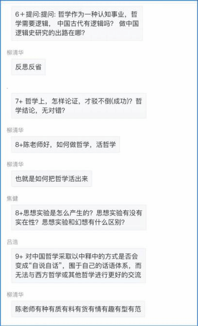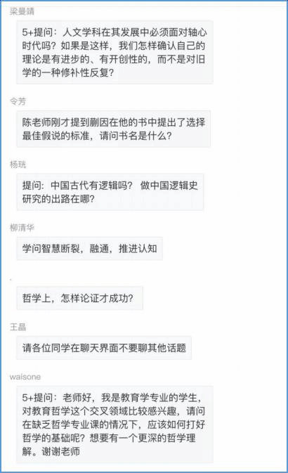 在具体展开上述各方面的论证时,陈教授还谈及了许多在哲学史上具有重大意义的话题。例如:在谈到人类的认知范围时,他指出人对世界的认知是有限的,认知边界将我们所面对的世界划成了“人化的实在”和“原生的实在”或“自在之物”两个部分,人类的认知活动应是一个不断外推、突破边界的过程。在谈到哲学家如何看待世界时,他将一般认知对象分成了五大类,并分享了自己的最新思考,指出这五类的区别主要体现在程度上。在谈到哲学如何促进人类认知的完善时,他介绍了塞尔的“社会实在论”和两个“休谟问题”的开创性意义。他还特别讲解了自己关于“实然如何推出应然”疑难的最新研究成果,指出既没有纯客观的事实,也没有纯主观的规范,“应然”是人们设定的“目标”相对于当下“实然”情况的“差距”而言的。在谈到科学和哲学在研究方法上的连续性时,他批评了历史上各种局限于某种意识形态的做法,强调解放思想的重要性。此外,他还介绍了“溯因推理”和思想实验的方法,并援引和发展了威廉姆森关于哲学与哲学史之关系的批判性观点。