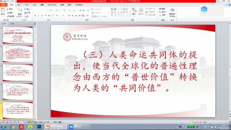 首先,丁立群教授对人类命运共同体的概念进行介绍,人类命运共同体作为全球治理和人类社会发展的新理念和新方案已经得到国际社会的广泛认可,并多次出现在联合国各项决议和文件中。这表明,人类命运共同体已超越了一国倡议阶段,成为国际社会新的共识。人类命运共同体思想是对马克思恩格斯思想在当前形势下的创造性发展。这一思想对中国特色社会主义和当代总体全球化具有重要的建设性意义。
