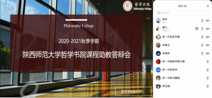 首先,由2020年秋季学期的课程助教进行工作汇报和答辩。各位助教依次就本学期的常规工作、讨论课组织及第二课堂参与情况等进行汇报,其中,讨论课的开展最能体现助教的自主性和组织力,各位助教着重就讨论课的设计、组织与开展进行经验分享,并反思和交流在讨论课策划与组织过程中出现的问题,以便为新一批助教提供经验。答辩环节,老师们分别从助教在讨论课中的作用、学习群的运营、讨论课流程等具体环节设置、学生对课程和书院的建议以及慕课课程的平台选择、组织管理等方面进一步提问,各位助教结合课程开展情况进行回应。