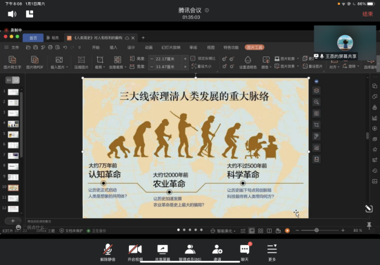 沙龙开始,主持人尹兆坤老师表达了对于沙龙战“疫”系列讲座的期望,他鼓励同学们在疫情期间沉下心来好好学习,做一个真正的读书人。首先,尹兆坤老师对《人类简史》这本著作做了简单的介绍。他认为《人类简史》实际上涉及到了人类的历史问题,而作者为我们提供了一个重要的视角去理解人类历史,这个角度实际上就是人类的革命,比如人类的信息技术革命和生物革命。尹兆坤老师表示,通过线上系列沙龙,学生可以对现在的畅销书以及繁杂的数据和信息有自己的反思,将各种知识进行内化吸收。