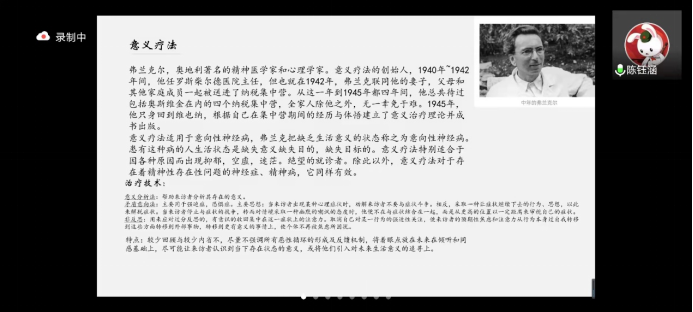 首先,她从心理学的专业知识出发,为大家介绍了弗兰克尔的意义疗法——通过引导患者为自己的人生赋予意义感来治愈他们的疾病。她介绍说,弗兰克尔是奥地利著名的精神医学家和心理学家,意义疗法的创始人。在1940年1942年间,他在奥地利一家医院当了两年主任,之后他与妻子儿女非常不幸地被送进了纳粹集中营,饱受四年的折磨。全家人除了他之外,无一幸免地被纳粹迫害致死。1945年,他只身回到了维也纳,根据当年自己在集中营的经历和体悟,写出了《意义疗法》这本书。意义疗法不仅使他在困境中守住精神家园,而且也造福于广大有着痛苦经历,无法摆脱人生虚无感的患者。这类患者的生活状态和生活意义是缺失的,因此他们可能会因为各种原因而出现抑郁、空虚、迷茫、绝望的心理状态。除此之外,对于存在着精神性、存在性问题的神经病,精神病,同样奏效。