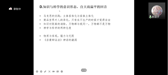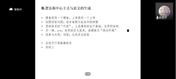 最后,郭同学讲到,对于人们来说,存在着这样一个虚无主义的时代,首先人们在这样一个时代中,并不是去寻找意义就能找到,因为这需要一种象征秩序的恢复,显然如今是一种意义不稳固的时代。但是在这个情况下,人们可以识破时代的谎言,人们可以更好的去做一种自己的谋划,这个时候如何走出这样一种象征秩序破碎的时代?其实有两个方向:因为社会现在正处在古代社会和现代社会这种过渡之间,古代社会就是群体生活,然后现代社会就是原子化生活,无论哪一种走到头了都是一个很好的秩序,人们都不会像这样压迫。所以一种方法是人们要重新恢复某种人与人之间的秩序;另外一个方法就是进一步促进原子化,使人和人都进一步的分离开,不会因为国家等群体而产生异议,这时任何人就不会彼此压迫了。