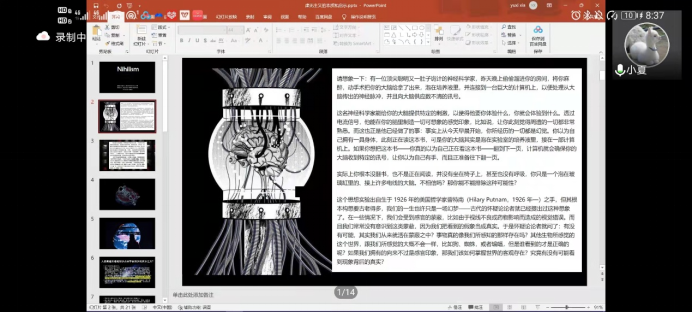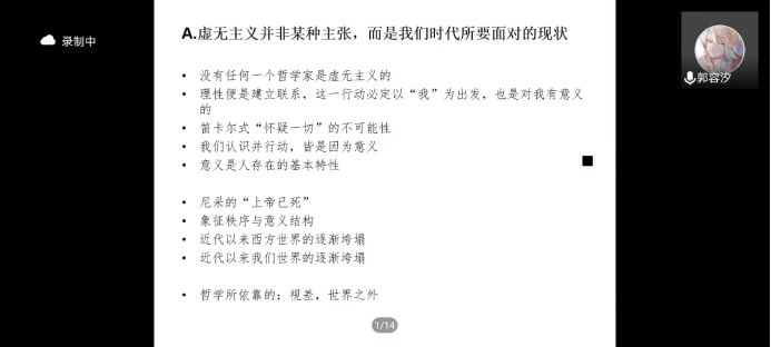 第三位分享者是来自外国语学院英语系2021级的夏妤茜同学。夏同学从宇宙论虚无主义的角度出发,为大家介绍了虚无主义出现的原因以及对待虚无主义的态度。