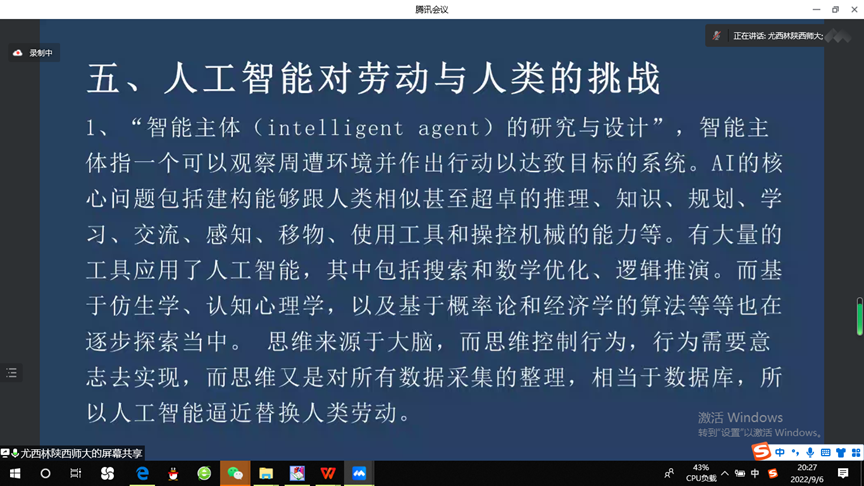 讲座最后一部分,尤老师讲述了我们现在面临着的人工智能对劳动和人类的挑战。AI要建构跟人类相似,甚至要超过人类的各种工作能力,它不是外在的操作工具的演进,而是对于操控工具的智能的人工化,人类面临着人工智能代替人类劳动的挑战。同时,由于生产率的提高,人类可能剩余更多的时间,进而面临着虚无主义和人的没落等危机。