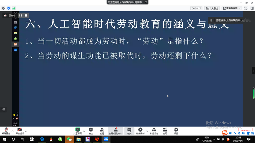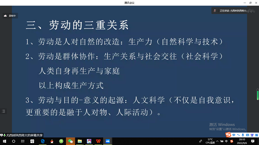 讲座的第三部分是尤老师关于劳动的三重关系的讨论。第一,劳动是人对自然的改造。最原初的劳动就是人和自然对自然的加工。第二,劳动一定是群体的劳动。最初的劳动起源于群体协作,在群体协作中发展形成了生产关系,而生产关系扩展为与生产无关的社会交往关系,就是社会科学。第三,劳动实际上是目的和意义的起源。目的和意义不是外在的目标,而是作为内在的目的。这种内在的目的,往往是和人生的价值和意义联系在一起。卢卡奇将其追溯到劳动。